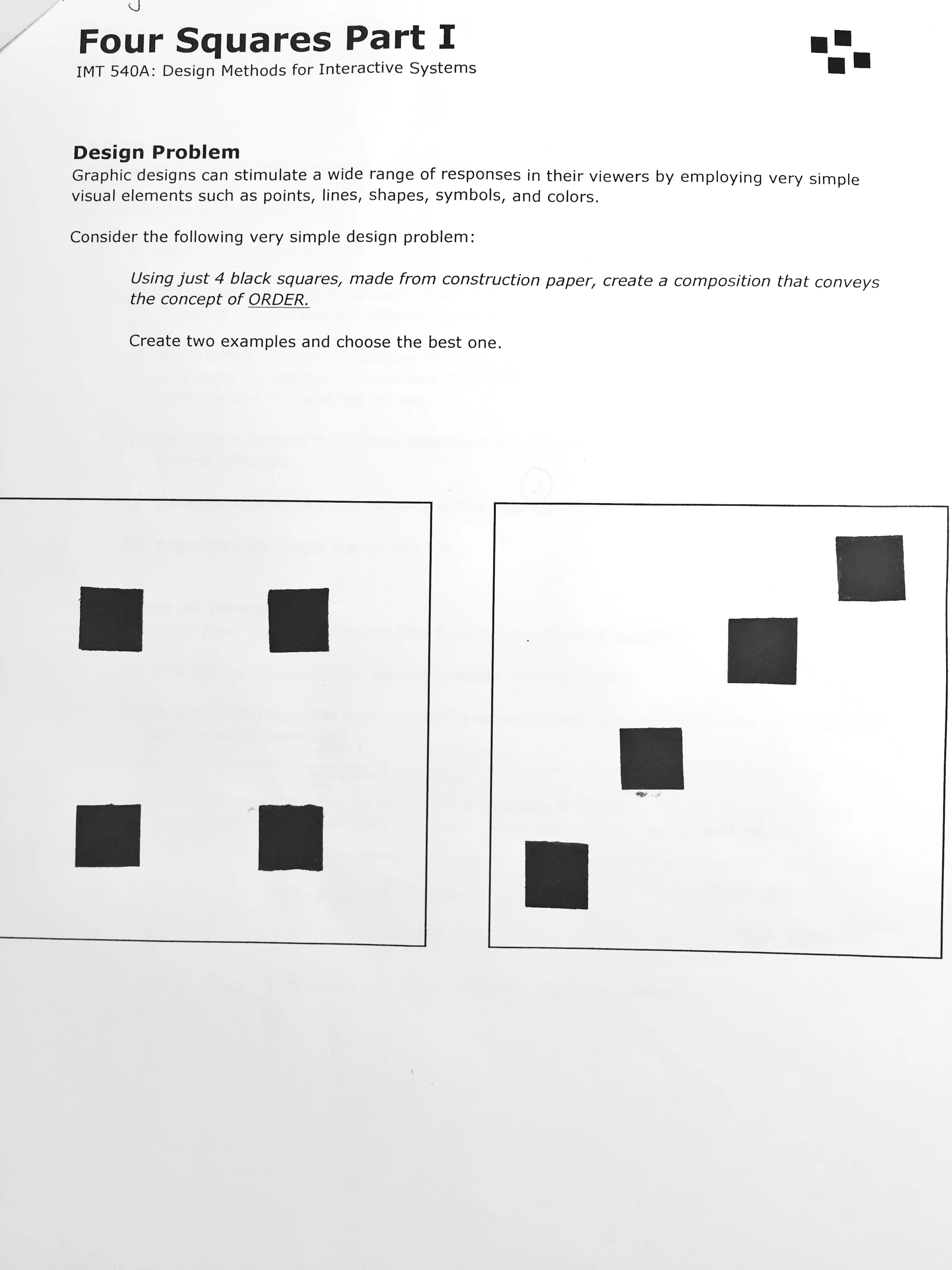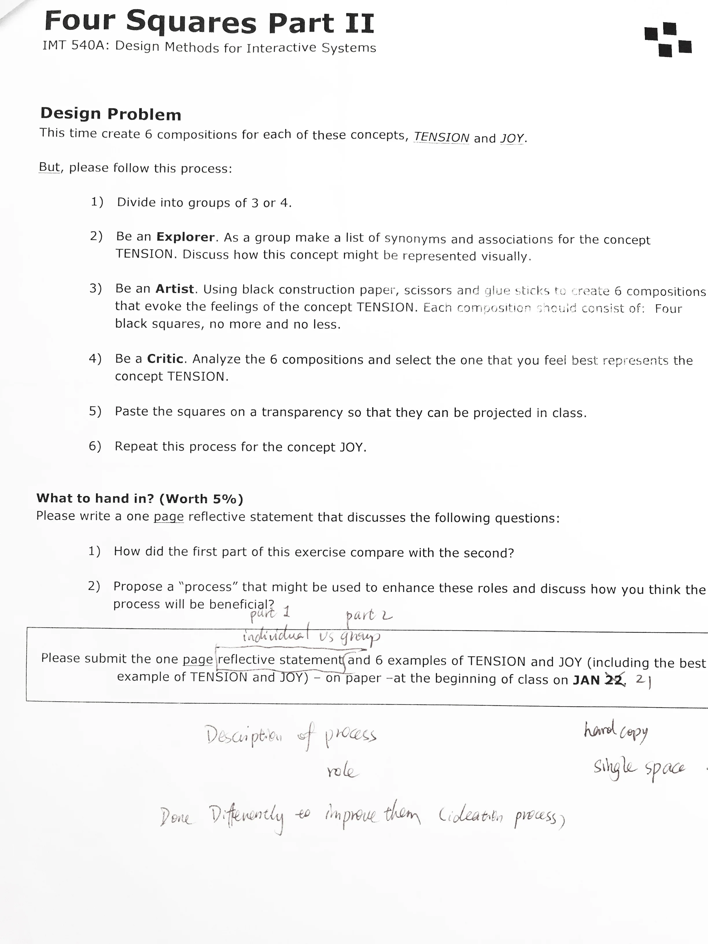 According to my experience, there are two differences between independent and group designing process. The first one is that we follow role play steps during group work, but I tend to skip those steps when designing alone. Since the whole process from brainstorming to the generation and evaluation of the idea happened in my own mind, the boundary between exploration and critique was not very clear. In fact, it’s so easy to “get blinded by our own myopic view” (Mountford, 1990) that I didn’t spend much time evaluating my own ideas. However, letting someone else critique my ideas improved the design a lot. I realized how other people understood my design, whether I conveyed the meaning behind my work and how I could improve it. For example, when we created compositions for the concept “tension”, I thought of an idea that we could stick three squares together in a line and left some space between the third and the fourth squares. It would look like four squares were hanged by a string but the fourth one was dropping down. However, my teammates thought it was not apparent enough to convey “tension” to the audiences, and they suggested we could turn over the squares and move the fourth square on the top so it looked like four boxes stacked together and the top box might drop at any time. Their comments were so great that the design looked much more tense. The second big difference is the collisions in brainstorm when we discussed within a group. I got lots of inspirations from my teammates which helped to shape my own ideas, and was encouraged to think more broadly and openly at the same time.